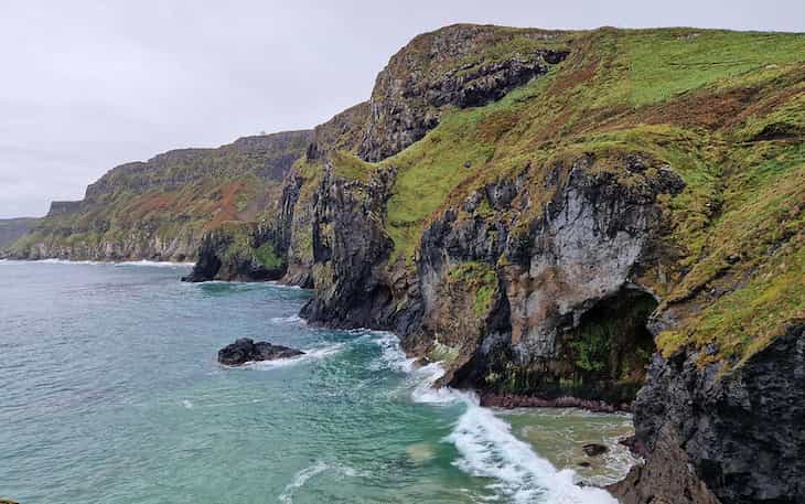 Unser nächster Halt, Carrick-a-Rede , ist selbst eine kleine Insel an der Küste. Vom Parkplatz zur Insel muss man zunächst einen etwa 20-minütigen Spaziergang unternehmen, bis man eine (sichere) Hängebrücke erreicht, die das Festland mit der Insel verbindet. Der Zugang ist zwar kostenpflichtig, aber dennoch ein Muss (Öffnungszeiten im Voraus prüfen!). Von Carrick-a-Rede aus habt ihr einen herrlichen Blick, auch auf die nahe gelegene Sheep Island und die steilen Klippen entlang der Küste.