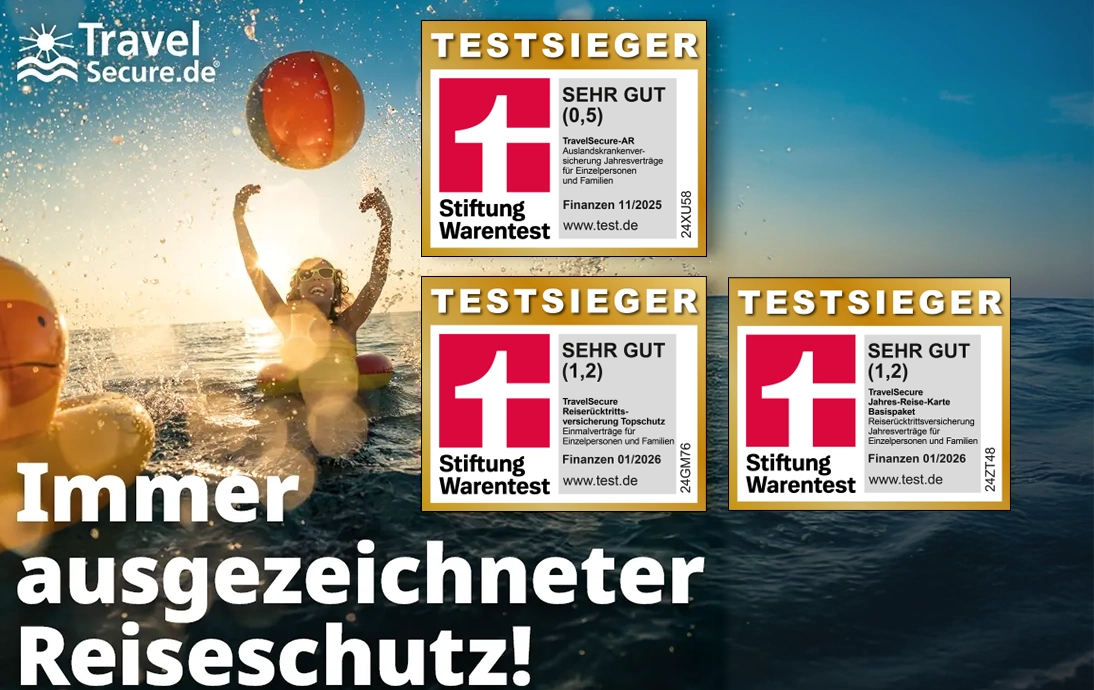 Der Tarif TravelSecure-AR von TravelSecure wurde bei Jahresverträgen für die Auslandsreisekrankenversicherung für Familien und Einzelpersonen mit der Note „SEHR GUT“ (0,5) als Testsieger gekürt.